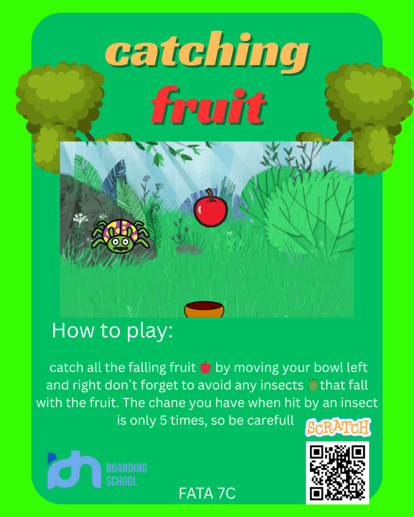 This game was made using Scratch and took about 2 hours to complete. There are several ways to play it: you can access it on Scratch.mit.edu by searching for “Catching Fruit By DzakirFy”, scan the QR code on the poster, or simply try it directly from the bottom section of this webpage.